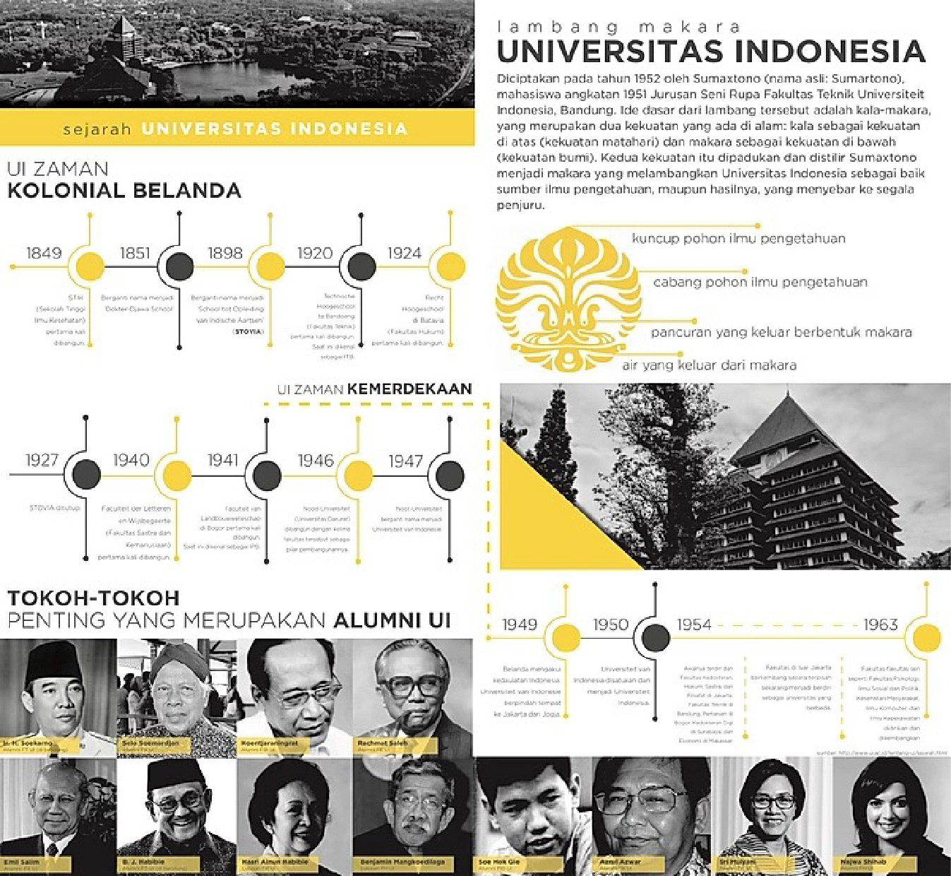 The design featured a clear timeline, notable alumni figures, and the meaning behind the iconic makara logo, using the university's signature yellow to create a cohesive and informative piece celebrating its legacy.